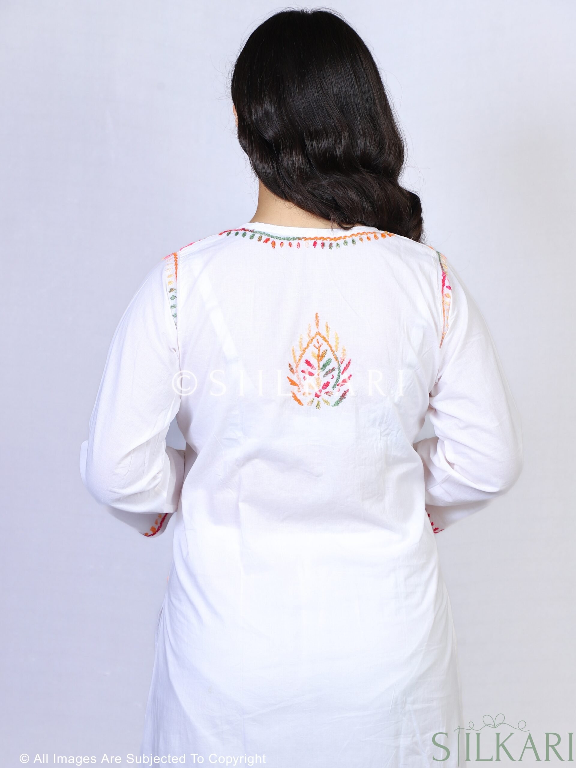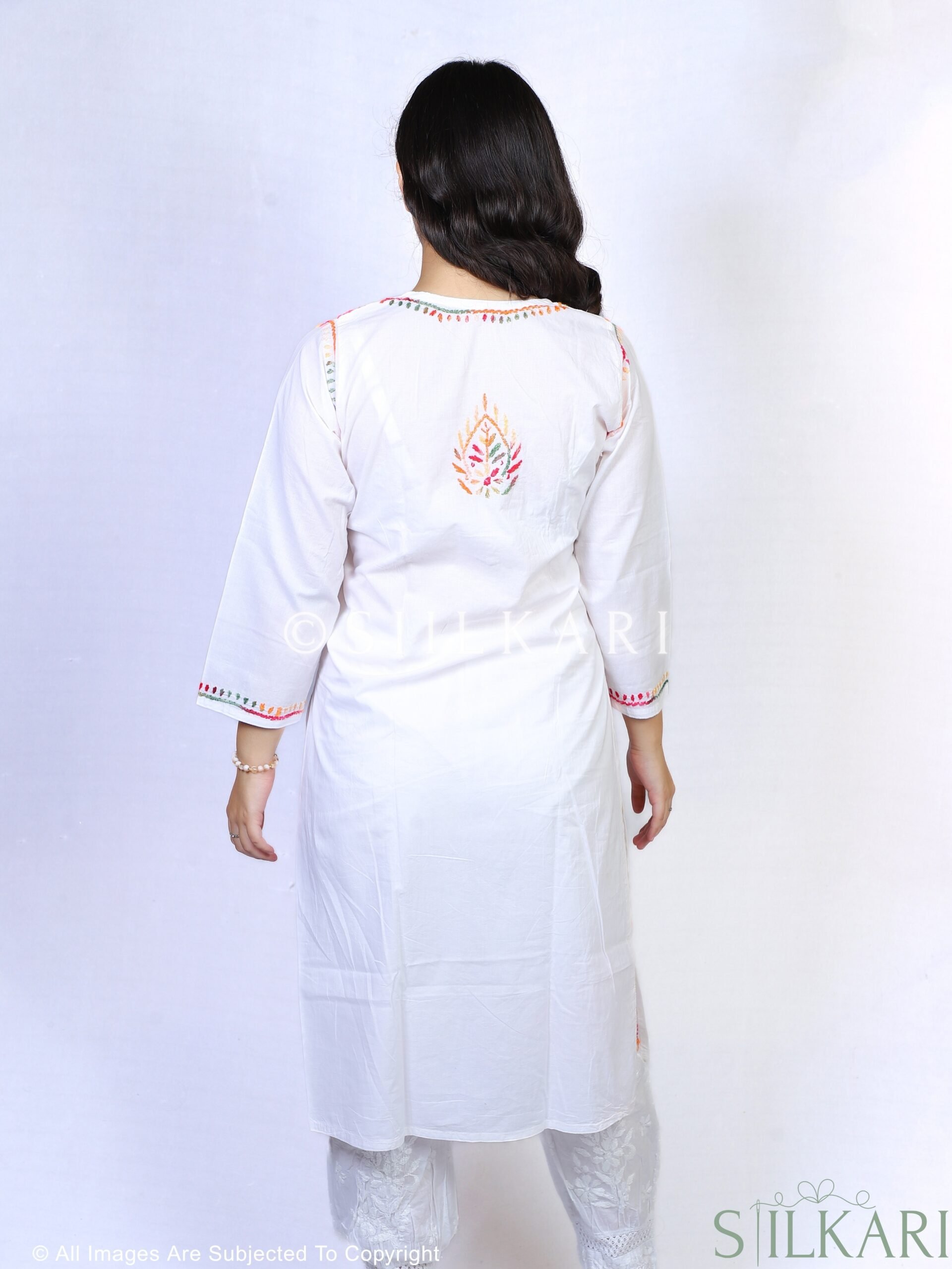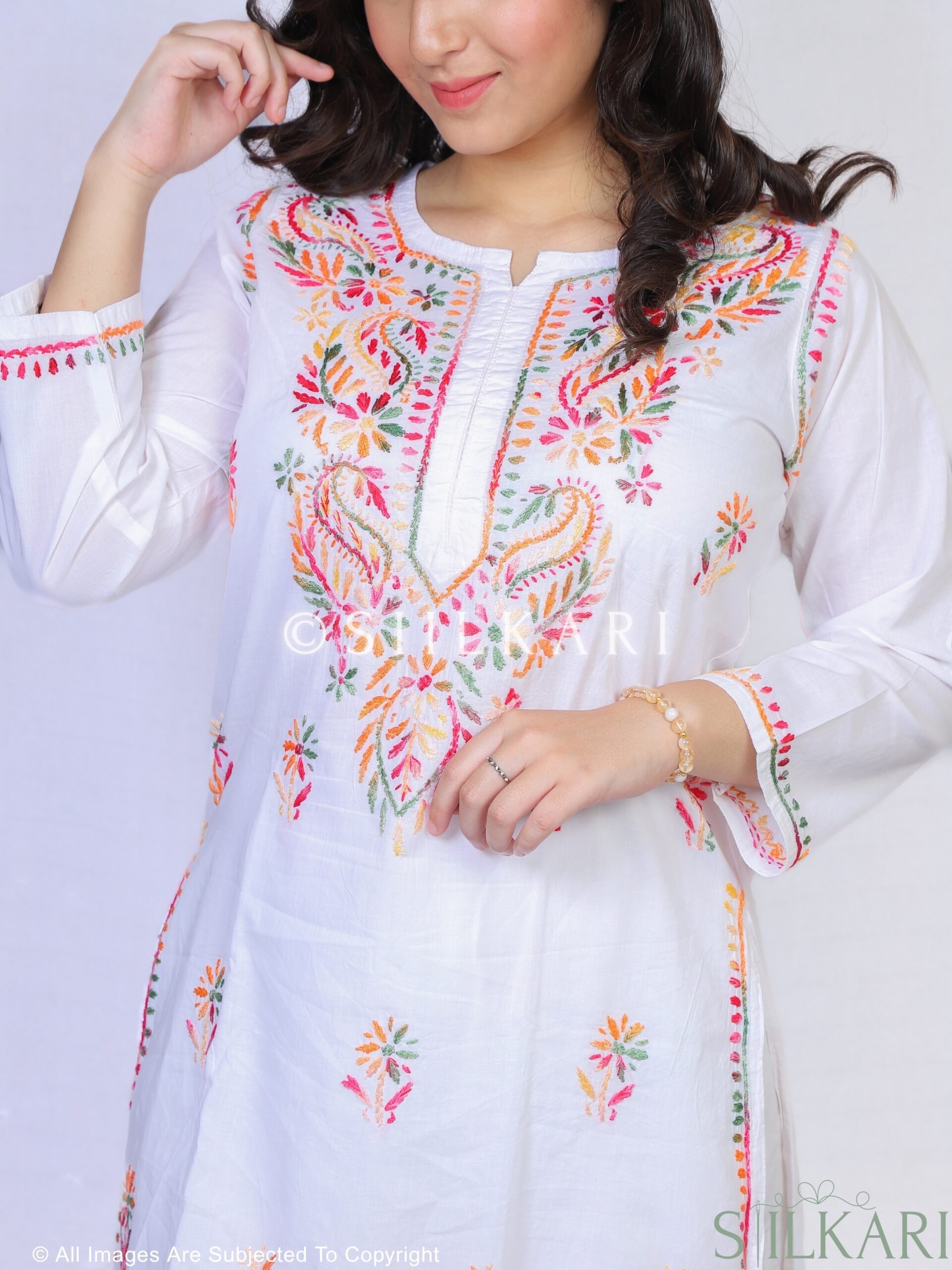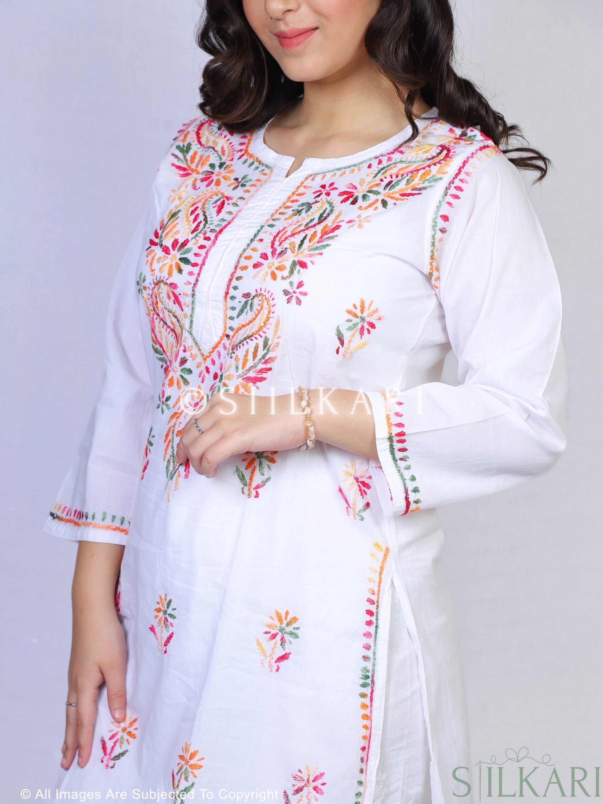 This Pure Cotton Multicolor Chikankari Kurti for women blends traditional Lucknowi hand embroidery with a modern ethnic wear appeal. Crafted from soft, breathable cotton, this kurti is perfect for daily wear, office wear, festive occasions, and summer outings. The intricate multicolor hand-embroidered Chikankari design adds a vibrant touch of elegance, while the comfortable straight-fit style makes it ideal for girls and women.