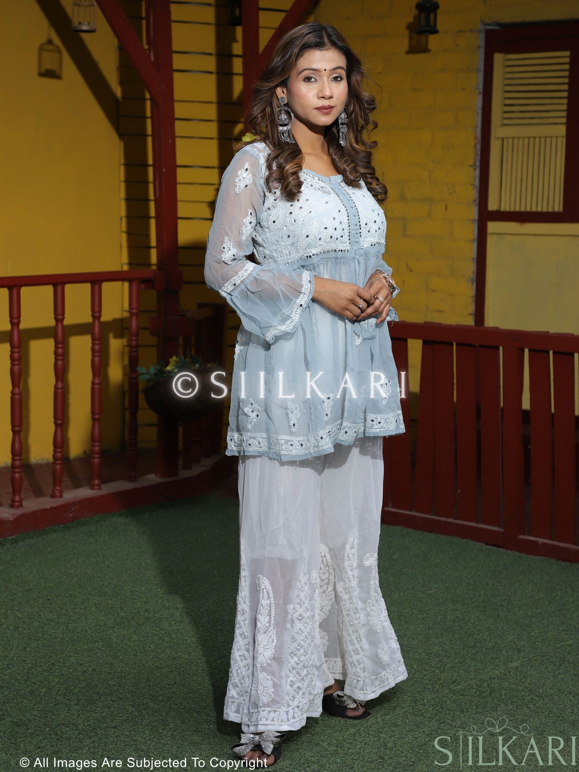 Add sparkle to your ethnic collection with this stunning Georgette Mirror-Embellished Chikankari Short Frock. Crafted on soft, flowy georgette fabric, it features handcrafted Lucknowi Chikankari embroidery enhanced with delicate mirror embellishments, giving it a festive yet graceful look.
