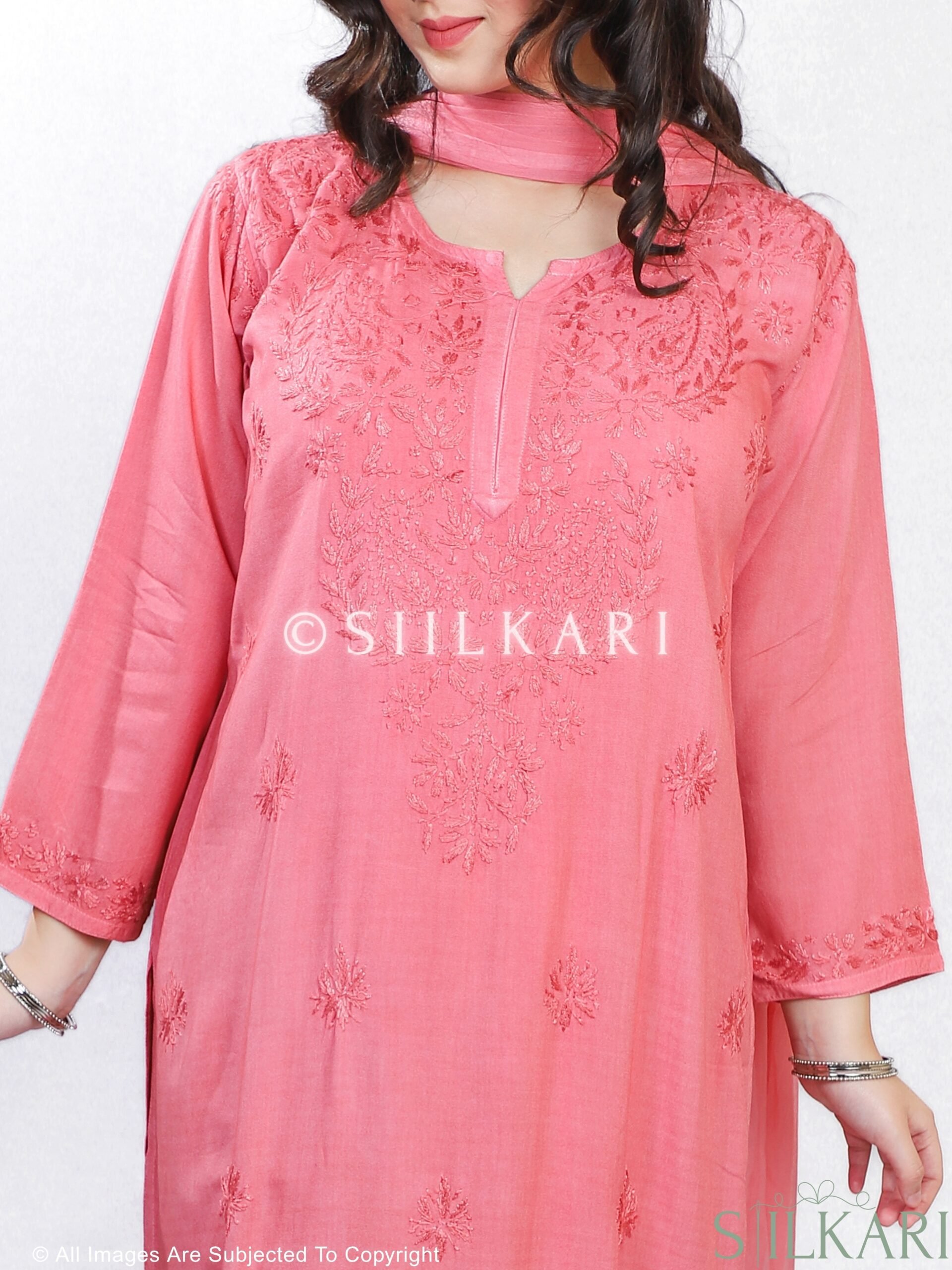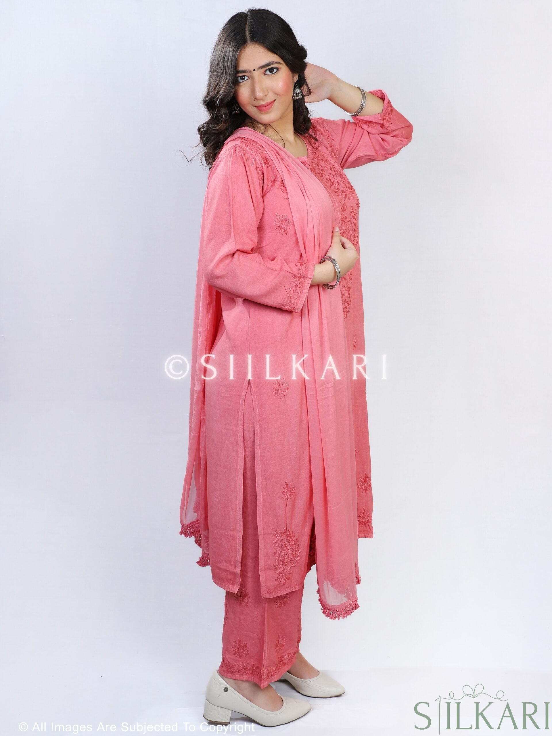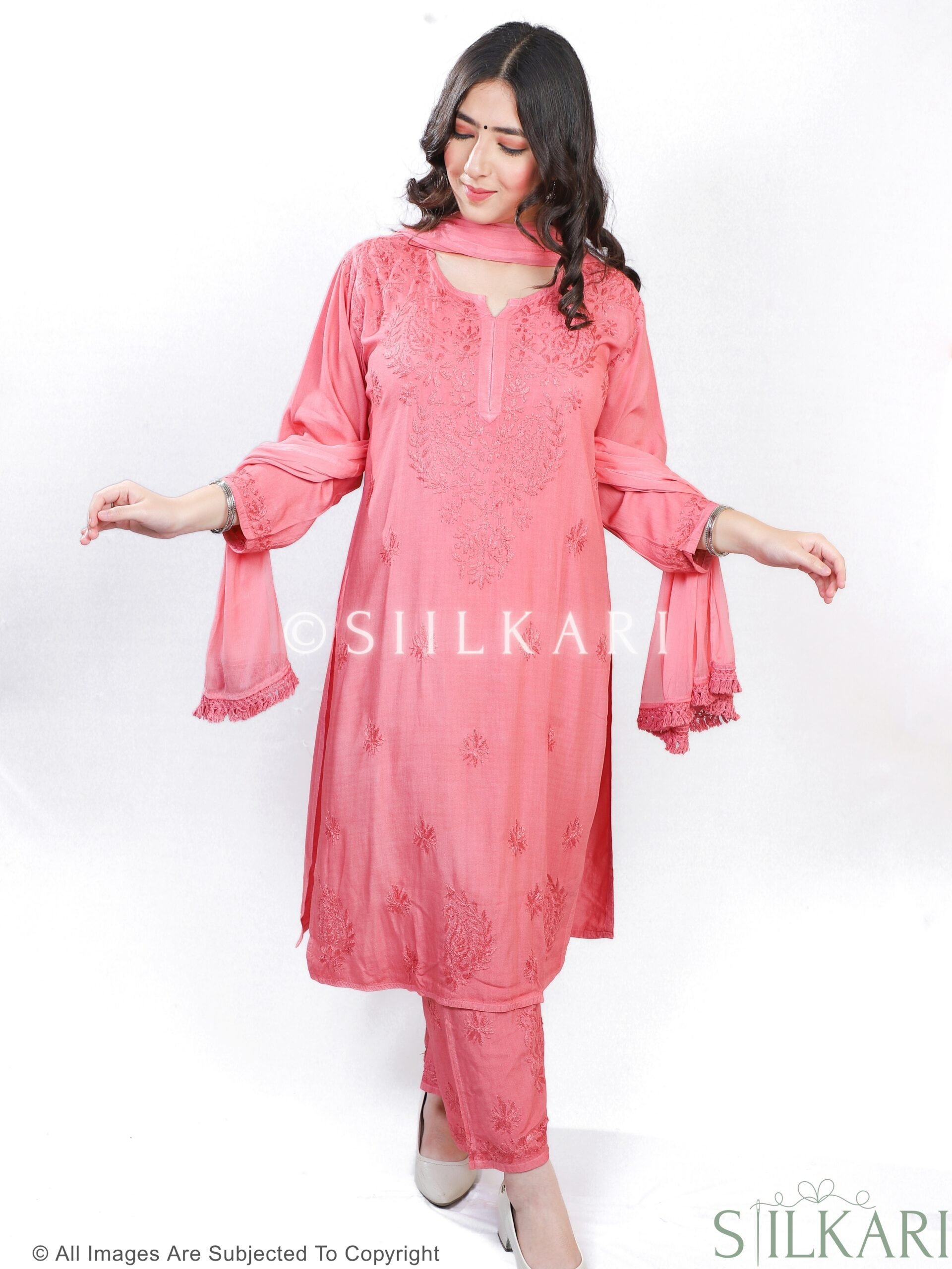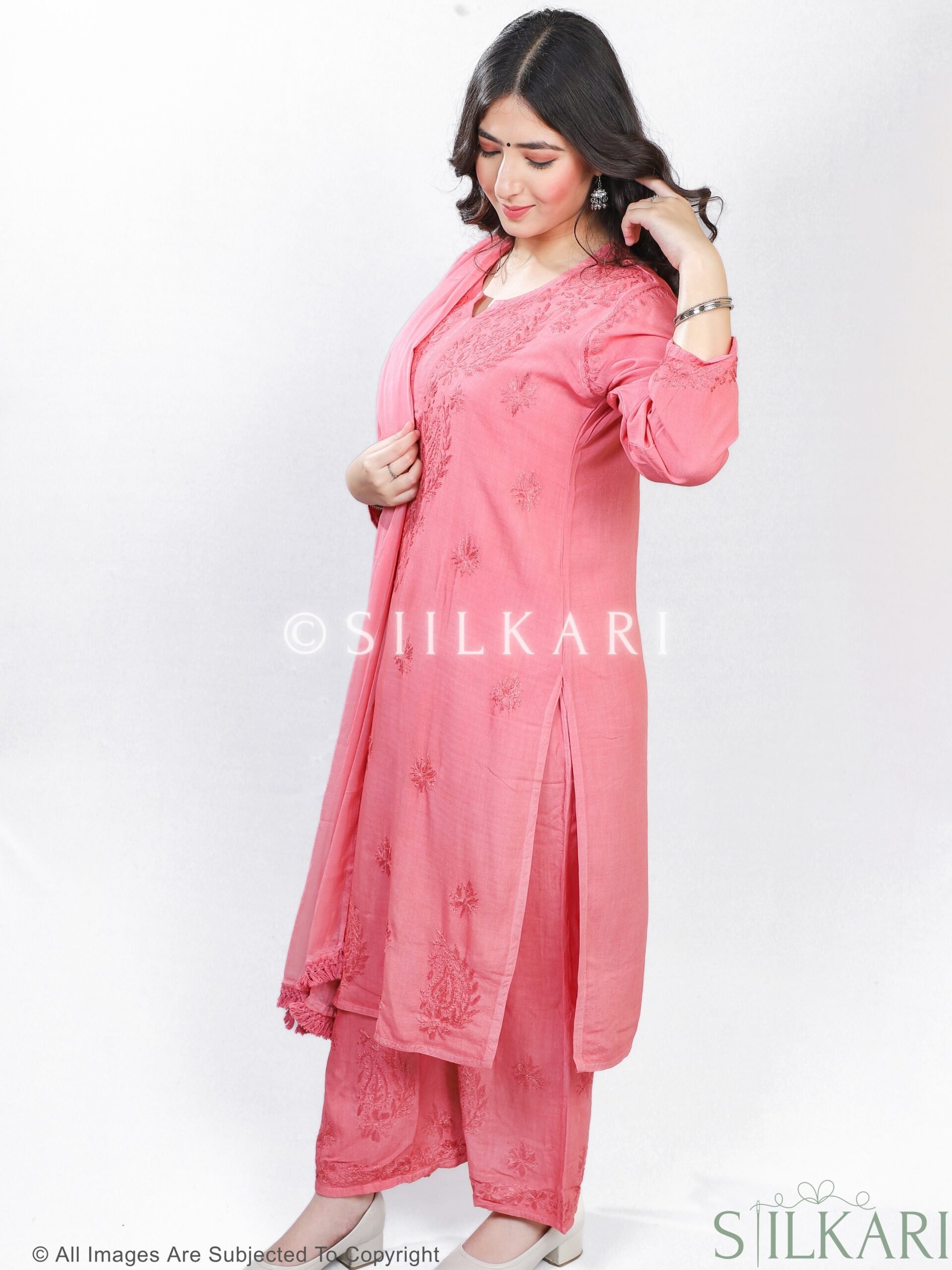 Experience the perfect blend of tradition and elegance with this Rayon Chikankari Kurti Palazzo Dupatta Set, beautifully handcrafted by skilled artisans from Lucknow. Designed in a straight-fit silhouette, the kurti features pure hand-embroidered Chikankari work, paired with a matching Chikankari-embroidered palazzo & Dupatta to create a timeless ethnic look.