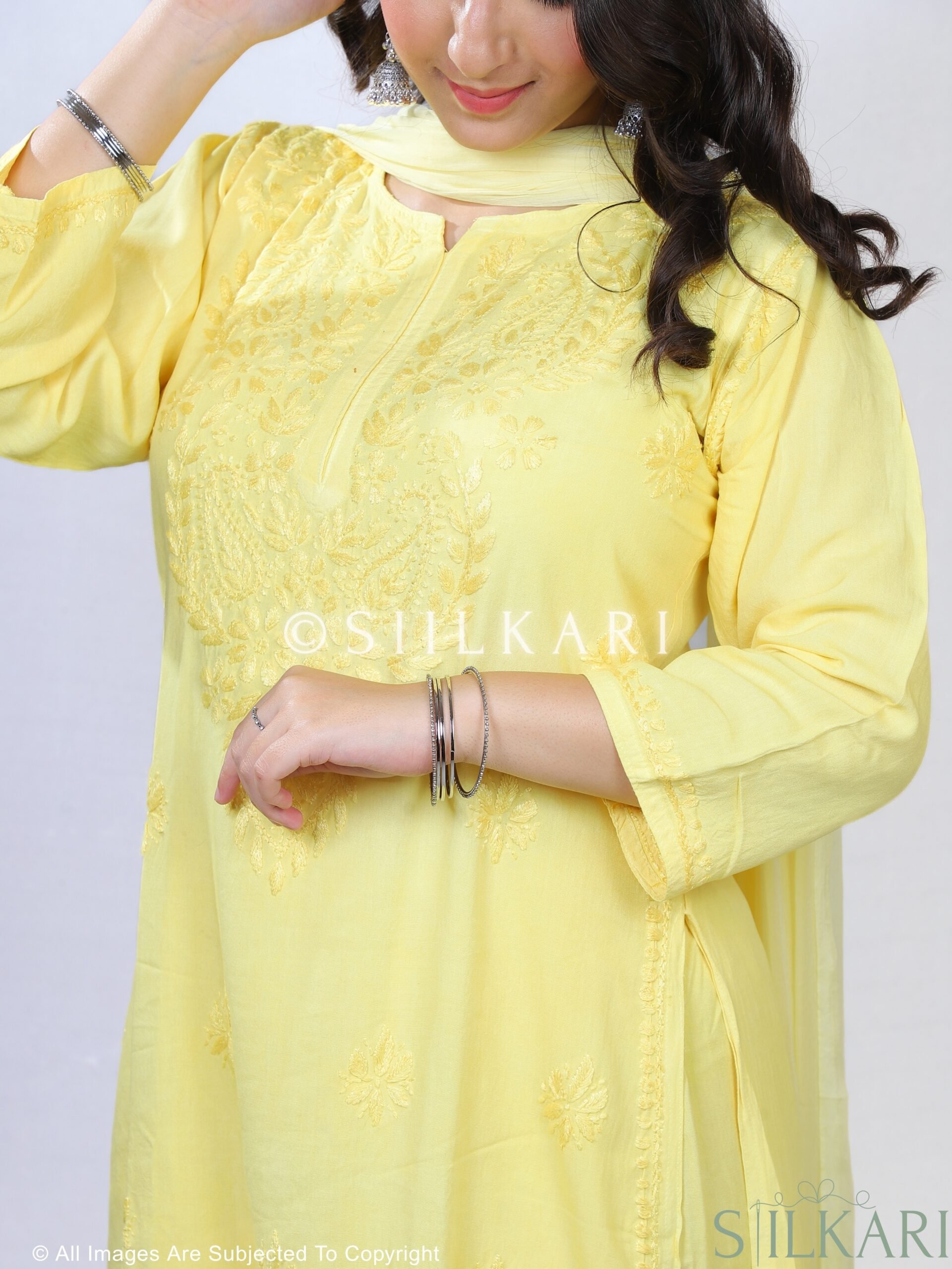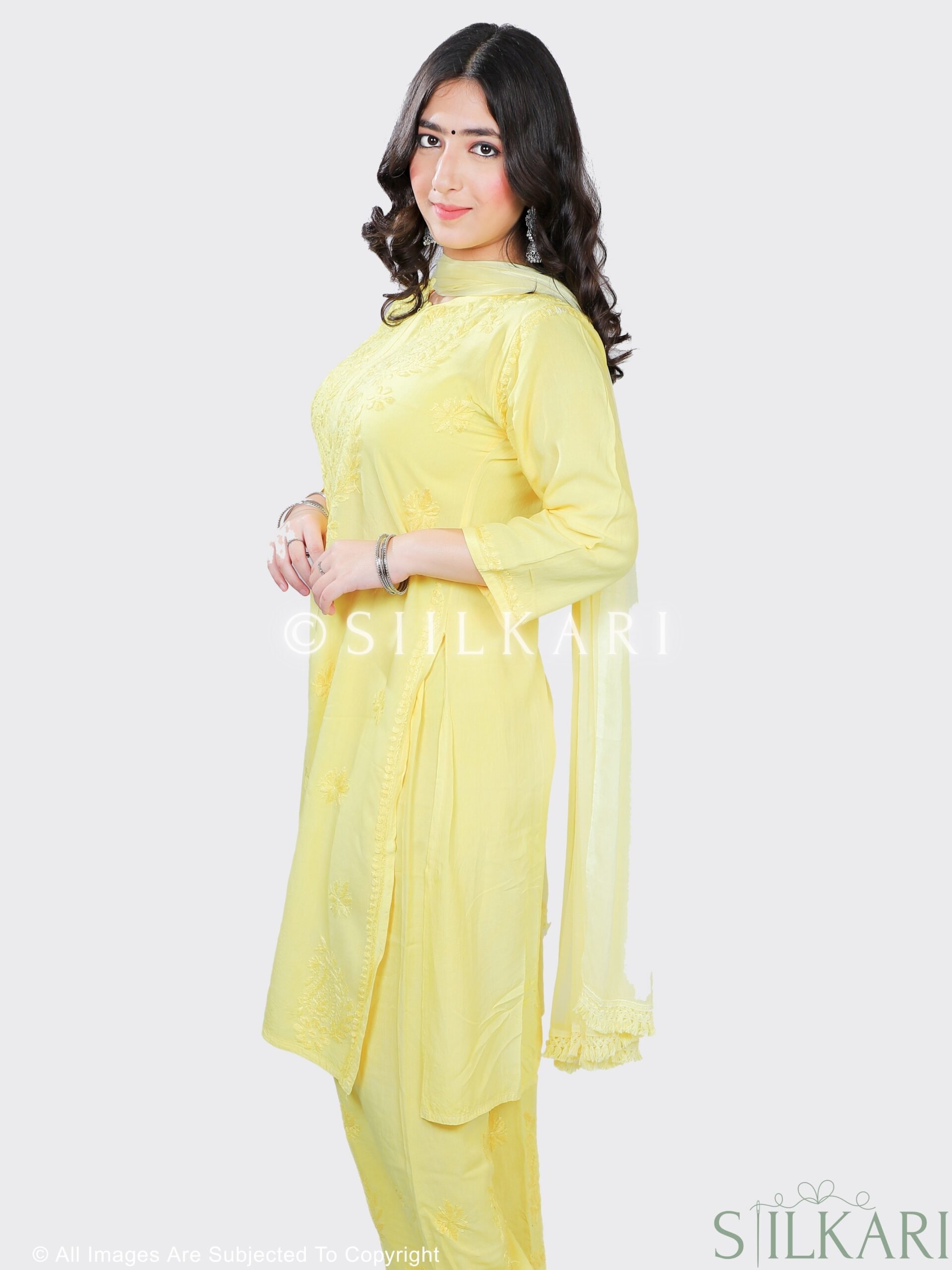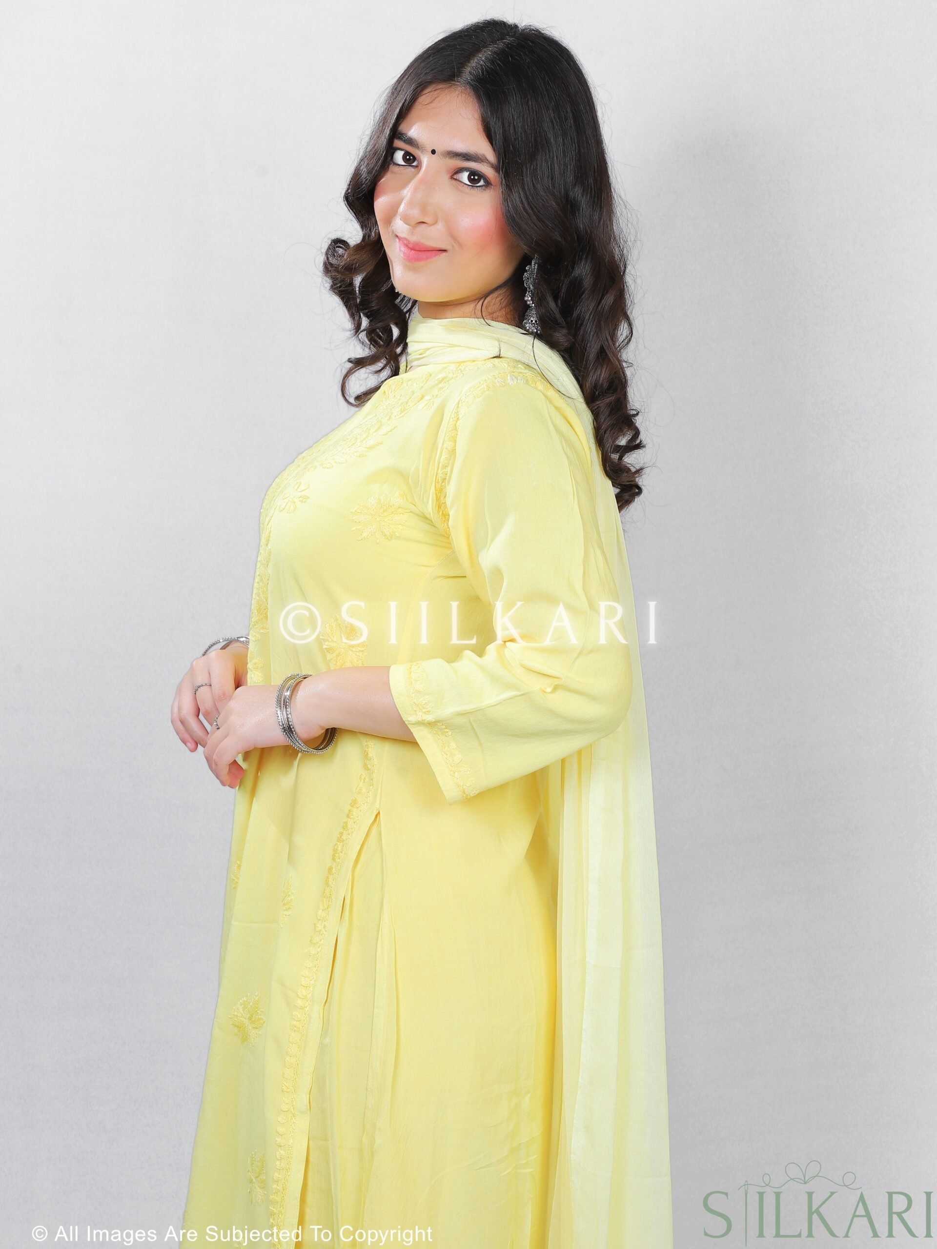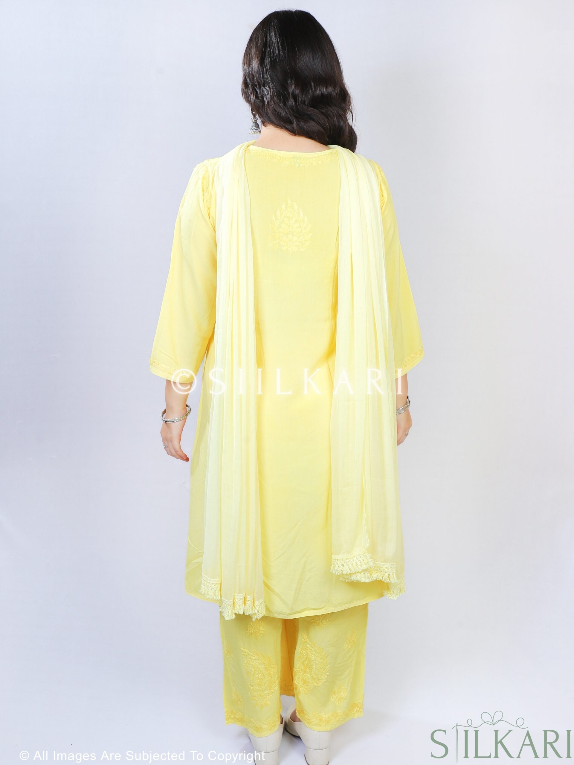 Experience the perfect blend of tradition and elegance with this Rayon Chikankari Kurti Palazzo Dupatta Set, beautifully handcrafted by skilled artisans from Lucknow. Designed in a straight-fit silhouette, the kurti features pure hand-embroidered Chikankari work, paired with a matching Chikankari-embroidered palazzo & Dupatta to create a timeless ethnic look.